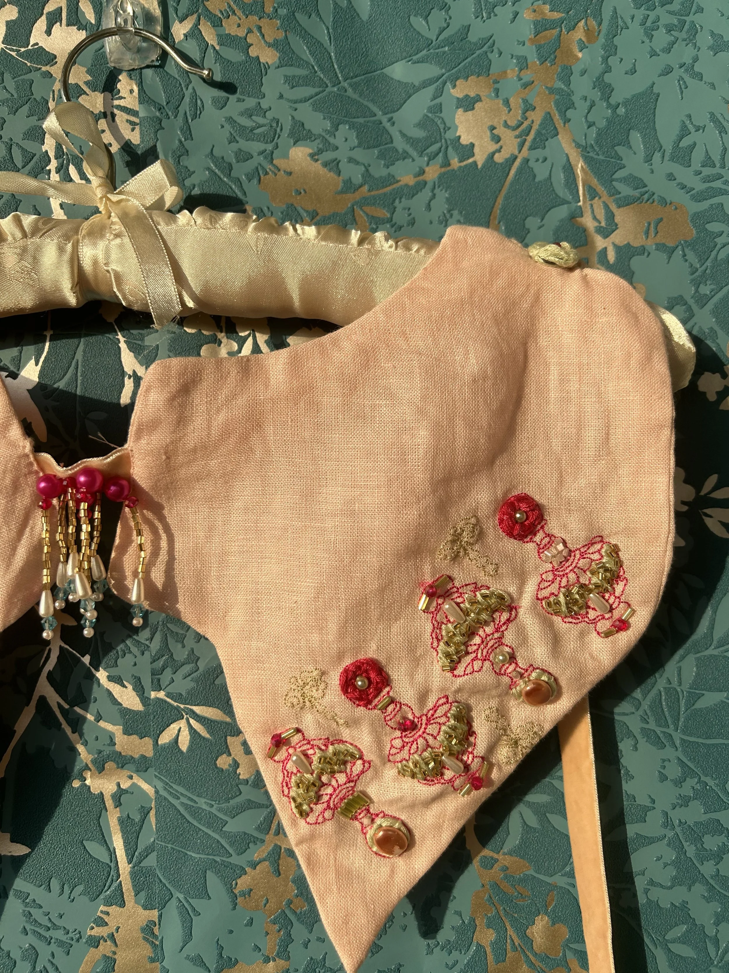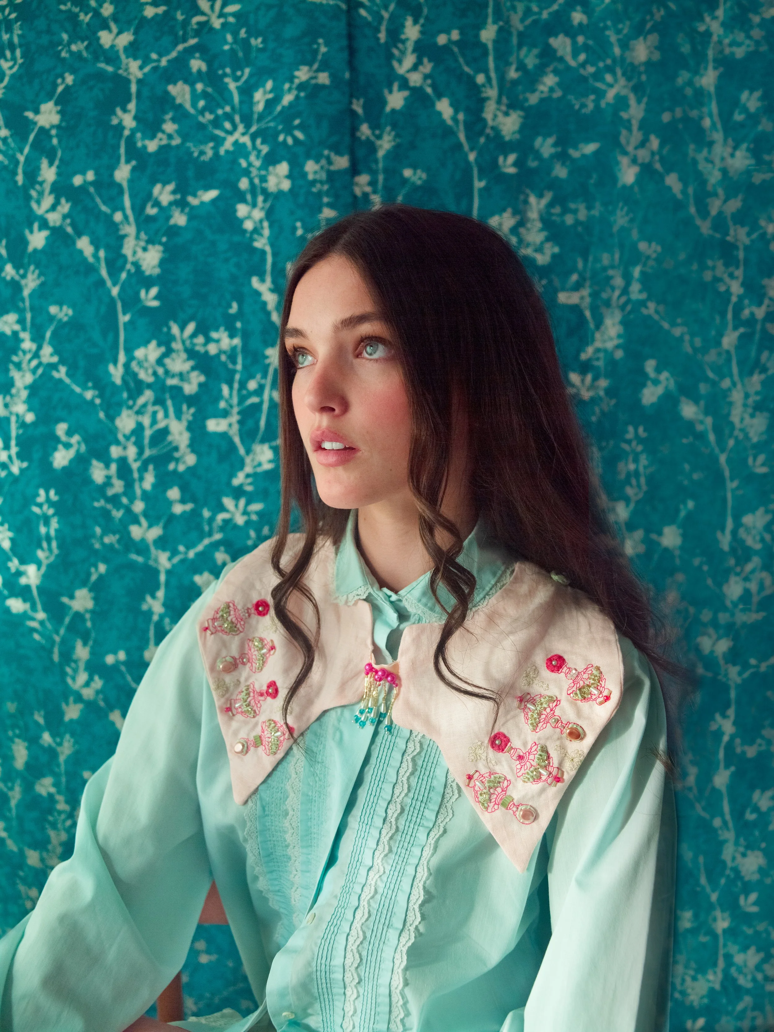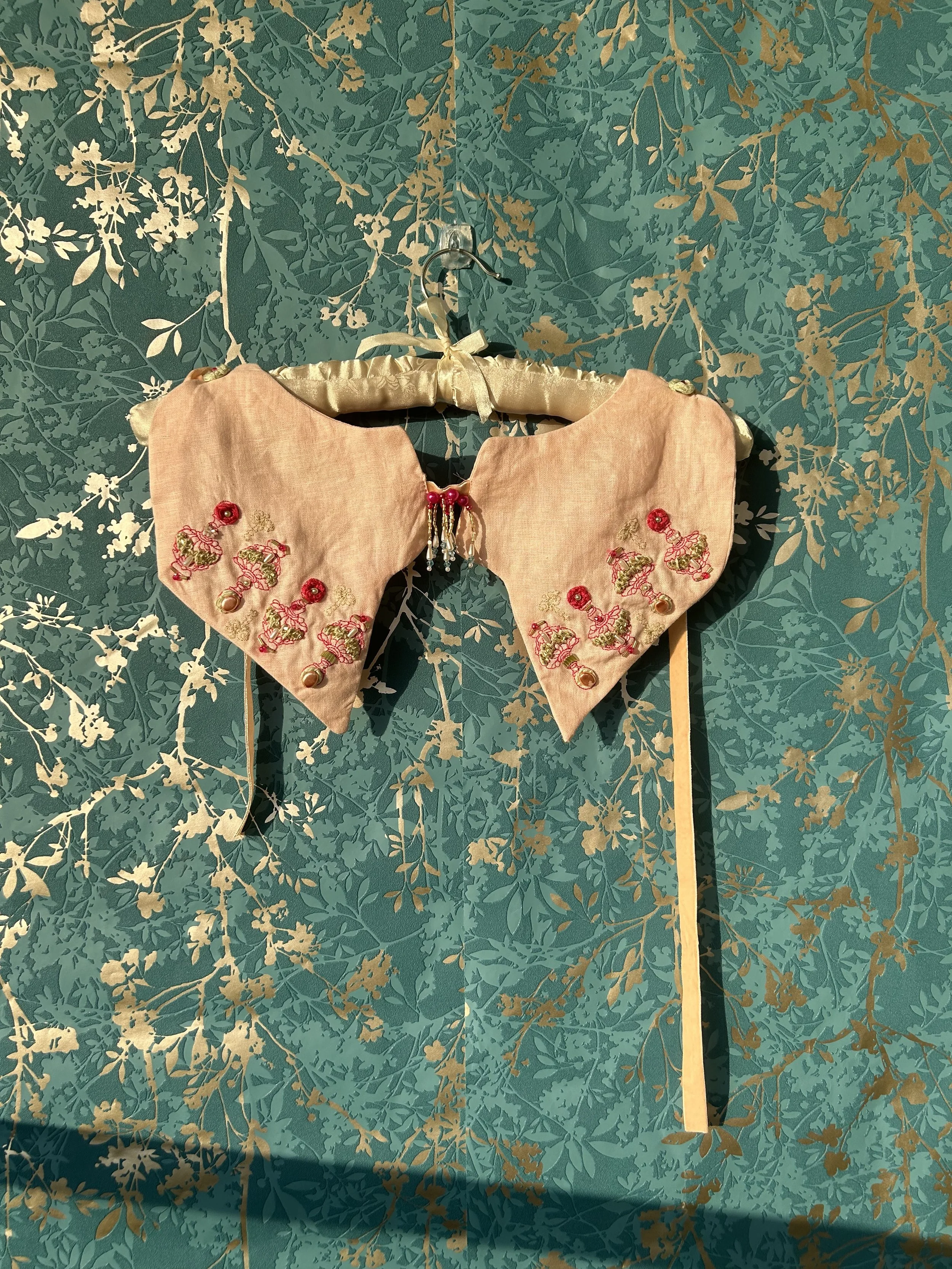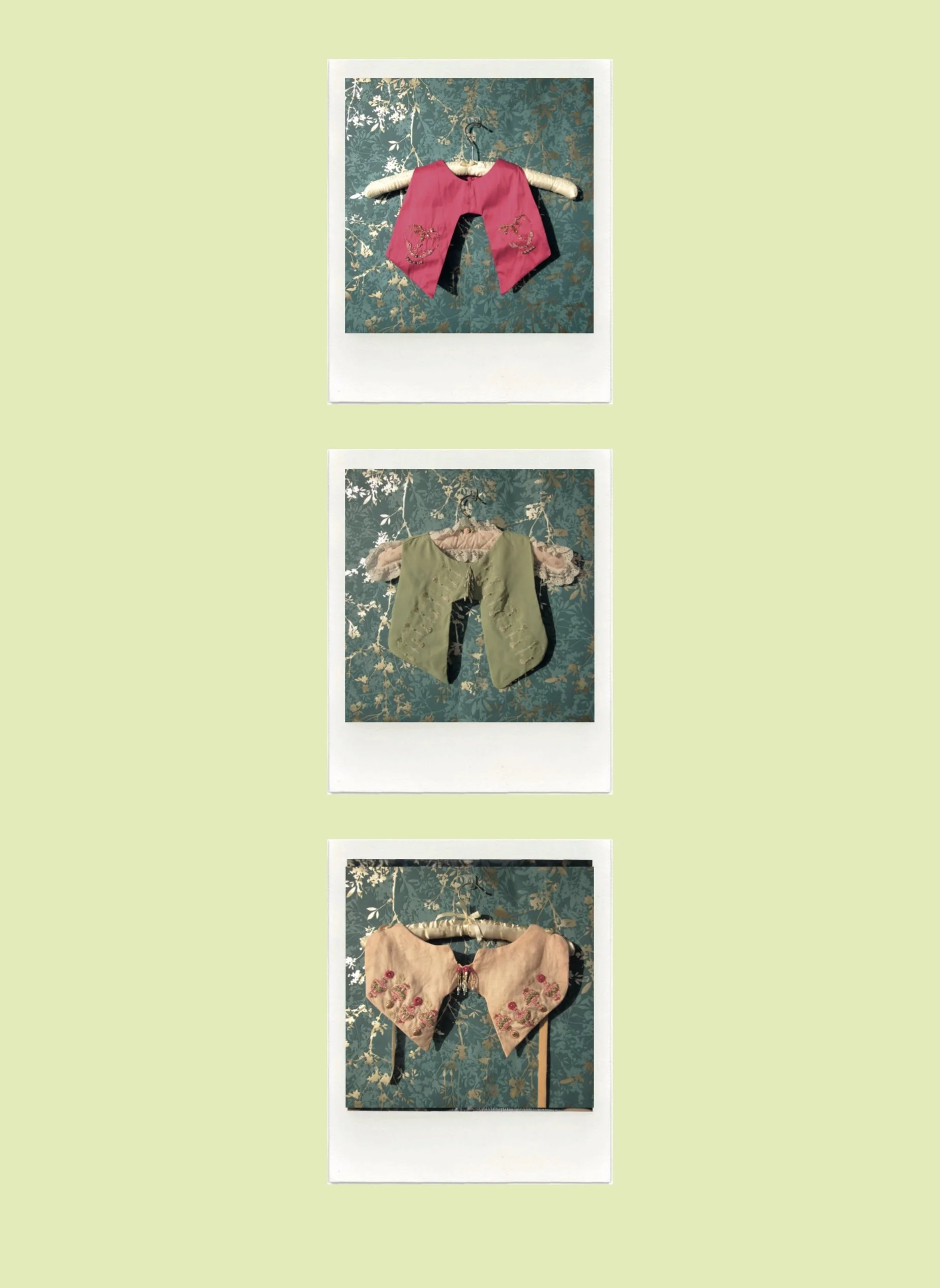 Final Graduate Collection exhibited at London Collage of Fashion Graduate Showcase 2023. Three hand embroidered collars with beading and goldwork techniques.